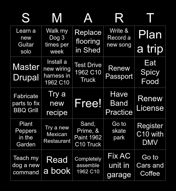 This bingo card has a free space and 24 words: Teach my dog a new command, Try a new Mexican Restaurant, Test Drive 1962 C10 Truck, Fix AC unit in garage, Plan a trip, Learn a new Guitar solo, Walk my Dog 3 times per week, Replace flooring in Shed, Have Band Practice, Renew License, Fabricate parts to fix BBQ Grill, Install a new wiring harness in 1962 C10, Go to skate park, Register C10 with DMV, Master Drupal, Read a book, Completely assemble 1962 C10, Write & Record a new song, Eat Spicy Food, Plant Peppers in the Garden, Try a new recipe, Sand, Prime, & Paint 1962 C10 Truck, Renew Passport and Go to Cars and Coffee.