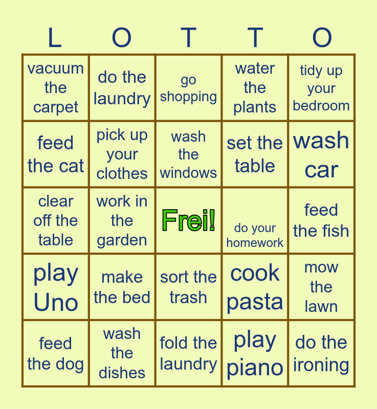 This bingo card has a free space and 24 words: make the bed, wash the dishes, wash the windows, feed the dog, tidy up your bedroom, vacuum the carpet, feed the cat, do the laundry, do your homework, sort the trash, set the table, clear off the table, cook pasta, mow the lawn, pick up your clothes, play piano, feed the fish, go shopping, wash car, work in the garden, do the ironing, play Uno, water the plants and fold the laundry.