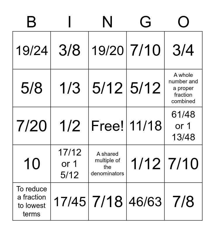This bingo card has a free space and 35 words: Denominator, Numerator, 11/12, 1/3, A shared multiple of the denominators, 7/10, 5/8, False, 5/12, Improper fraction, 7/20, 3/4, 1/2, 17/12 or 1 5/12, 19/24, 11/18, 46/63, 1/2, 10, 7/8, 1/12, To reduce a fraction to lowest terms, 7/10, 17/45, 19/20, A whole number and a proper fraction combined, 1/4, 23/21 or 1 2/21, 5/12, 61/48 or 1 13/48, A fraction greater than 1 (numerator > denominator), 7/18, 17/12 or 1 5/12, 3/8 and True.