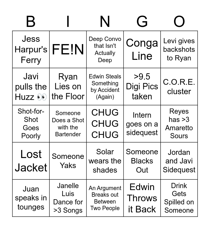 This bingo card has a free space and 24 words: Someone Yaks, Janelle Luis Dance for >3 Songs, Edwin Steals Something by Accident (Again), Juan speaks in tounges, Levi gives backshots to Ryan, Jess Harpur's Ferry, Javi pulls the Huzz 👀, FE!N, Intern goes on a sidequest, Solar wears the shades, >9.5 Digi Pics taken, Shot-for-Shot Goes Poorly, Someone Blacks Out, Jordan and Javi Sidequest, Ryan Lies on the Floor, Edwin Throws it Back, Reyes has >3 Amaretto Sours, Deep Convo that Isn't Actually Deep, C.O.R.E. cluster, Someone Does a Shot with the Bartender, Drink Gets Spilled on Someone, Lost Jacket, Conga Line and An Argument Breaks out Between Two People.