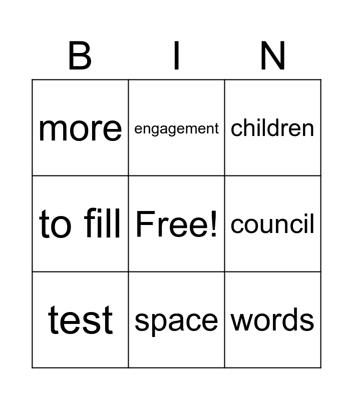 This bingo card has a free space and 8 words: council, children, engagement, test, more, words, to fill and space.