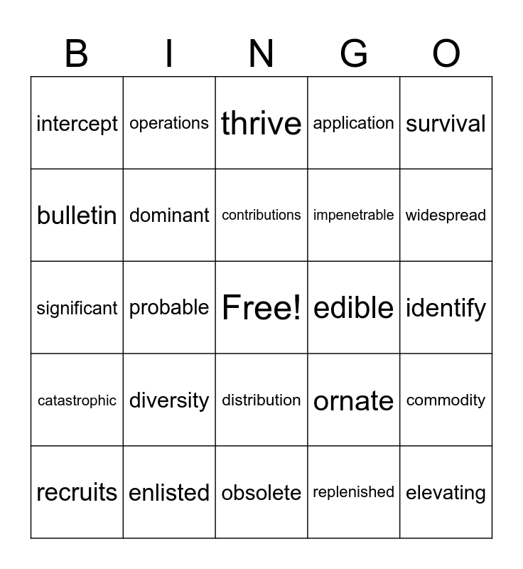This bingo card has a free space and 24 words: diversity, enlisted, contributions, recruits, survival, intercept, bulletin, operations, edible, distribution, impenetrable, significant, ornate, commodity, dominant, replenished, identify, thrive, widespread, probable, elevating, catastrophic, application and obsolete.