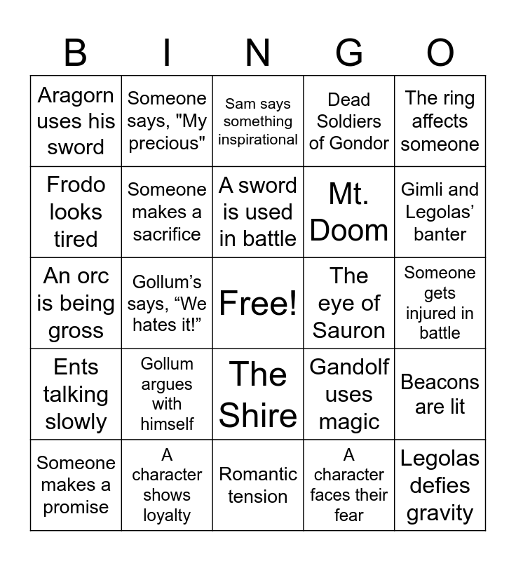 This bingo card has a free space and 24 words: Gollum argues with himself, A character shows loyalty, A sword is used in battle, Someone makes a promise, The ring affects someone, Aragorn uses his sword, Frodo looks tired, Someone says, "My precious", The eye of Sauron, The Shire, Mt. Doom, An orc is being gross, Gandolf uses magic, Beacons are lit, Someone makes a sacrifice, A character faces their fear, Someone gets injured in battle, Sam says something inspirational, Gimli and Legolas’ banter, Gollum’s says, “We hates it!”, Legolas defies gravity, Ents talking slowly, Dead Soldiers of Gondor and Romantic tension.