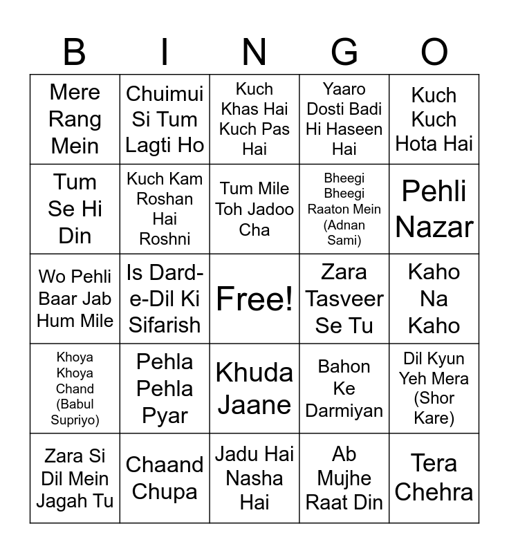 This bingo card has a free space and 30 words: Chaand Chupa, Bepanah Pyar Hai, Is Dard-e-Dil Ki Sifarish, Ek Duje Ke Vaaste, Mere Rang Mein, Kuch Khas Hai Kuch Pas Hai, Kuch Kam Roshan Hai Roshni, Khuda Jaane, Zara Tasveer Se Tu, Jadu Hai Nasha Hai, Kaho Na Kaho, Tera Chehra, Ab Mujhe Raat Din, Rimjhim Rimjhim, Pehli Nazar, Ek Din Teri Raho Mein, Bahon Ke Darmiyan, Khoya Khoya Chand (Babul Supriyo), Pehla Pehla Pyar, Kuch Kuch Hota Hai, Wo Pehli Baar Jab Hum Mile, Lagi Aaj Sawan Ki, Chuimui Si Tum Lagti Ho, Bheegi Bheegi Raaton Mein (Adnan Sami), Tum Se Hi Din, Yaaro Dosti Badi Hi Haseen Hai, Dil Kyun Yeh Mera (Shor Kare), Zara Si Dil Mein Jagah Tu, Tum Mile Toh Jadoo Cha and Hasi Ban Gaye.
