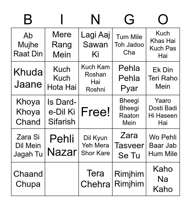 This bingo card has a free space and 28 words: Chaand Chupa, Bepanah Pyar Hai, Is Dard-e-Dil Ki Sifarish, Ek Duje Ke Vaaste, Mere Rang Mein, Kuch Khas Hai Kuch Pas Hai, Kuch Kam Roshan Hai Roshni, Khuda Jaane, Zara Tasveer Se Tu, Kaho Na Kaho, Tera Chehra, Ab Mujhe Raat Din, Rimjhim Rimjhim, Pehli Nazar, Ek Din Teri Raho Mein, Bahon Ke Darmiyan, Khoya Khoya Chand, Pehla Pehla Pyar, Kuch Kuch Hota Hai, Wo Pehli Baar Jab Hum Mile, Lagi Aaj Sawan Ki, Chuimui Si Tum Lagti Ho, Bheegi Bheegi Raaton Mein, Yaaro Dosti Badi Hi Haseen Hai, Dil Kyun Yeh Mera Shor Kare, Zara Si Dil Mein Jagah Tu, Tum Mile Toh Jadoo Cha and Hasi Ban Gaye.