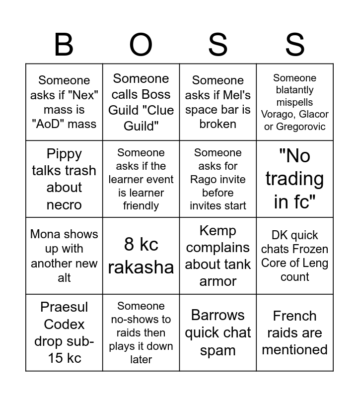 This bingo card has 16 words: Someone no-shows to raids then plays it down later, DK quick chats Frozen Core of Leng count, Someone asks if Mel's space bar is broken, Someone asks if "Nex" mass is "AoD" mass, Mona shows up with another new alt, Someone calls Boss Guild "Clue Guild", Kemp complains about tank armor, Barrows quick chat spam, Pippy talks trash about necro, Someone asks if the learner event is learner friendly, Praesul Codex drop sub-15 kc, Someone blatantly mispells Vorago, Glacor or Gregorovic, 8 kc rakasha, "No trading in fc", Someone asks for Rago invite before invites start and French raids are mentioned.