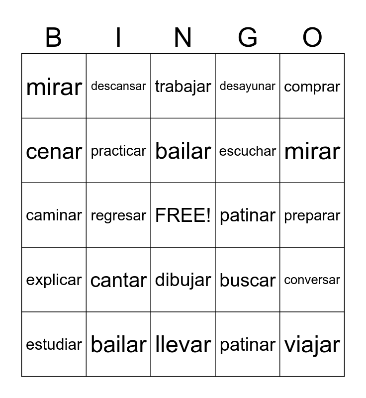 This bingo card has a free space and 24 words: cantar, bailar, bailar, estudiar, comprar, mirar, cenar, descansar, patinar, dibujar, escuchar, caminar, buscar, conversar, practicar, patinar, preparar, trabajar, mirar, regresar, viajar, explicar, desayunar and llevar.