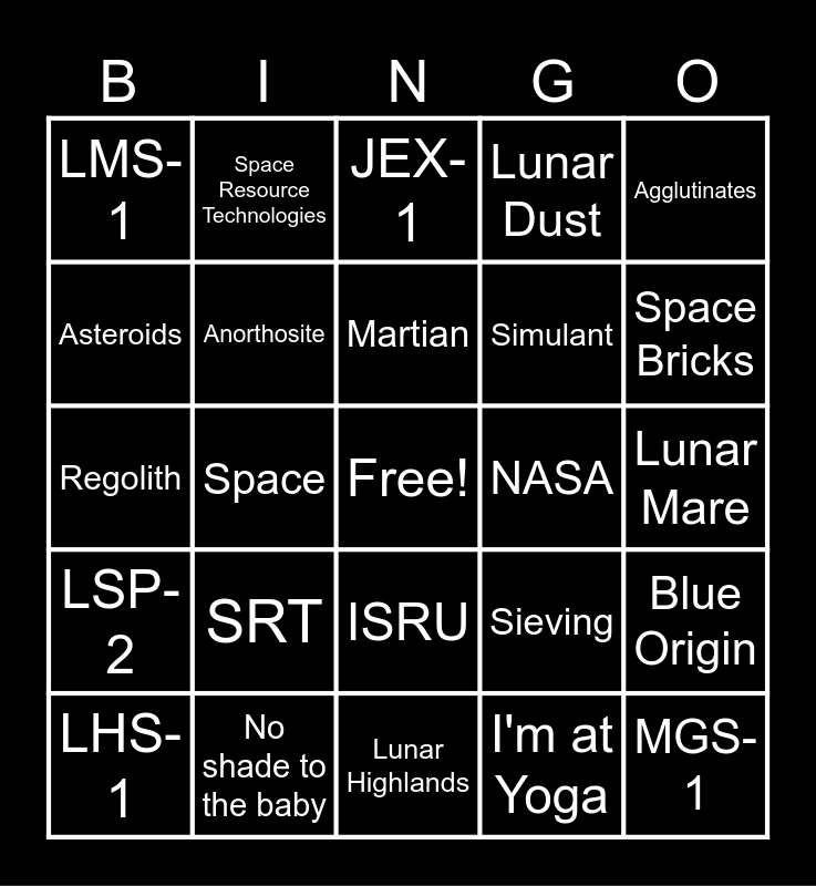 This bingo card has a free space and 24 words: SRT, No shade to the baby, Martian, LHS-1, Agglutinates, LMS-1, Asteroids, Space Resource Technologies, NASA, ISRU, Simulant, Regolith, Sieving, Blue Origin, Anorthosite, I'm at Yoga, Lunar Mare, JEX-1, Space Bricks, Space, MGS-1, LSP-2, Lunar Dust and Lunar Highlands.