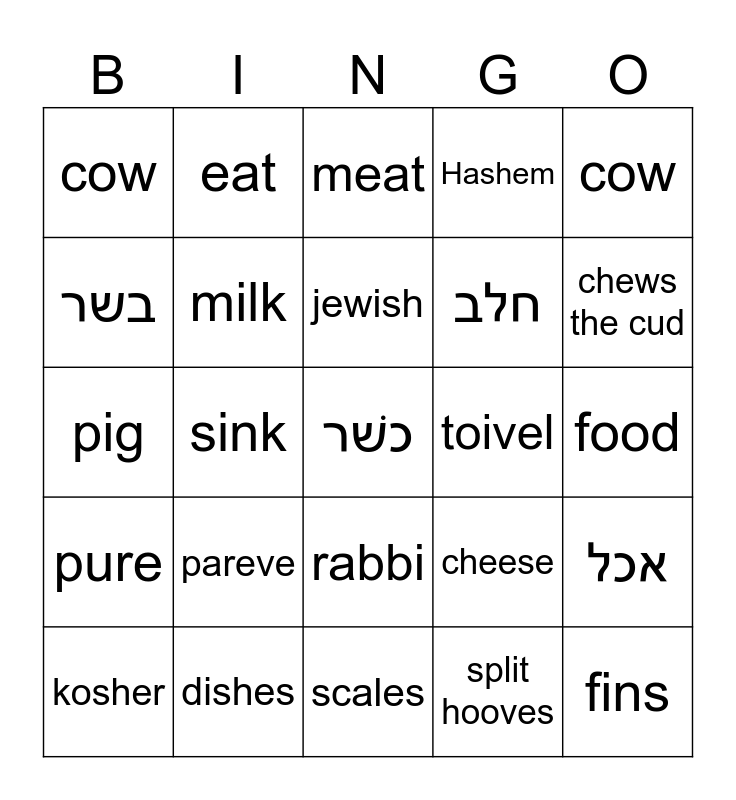 This bingo card has a free space and 29 words: kosher, kitchen, sink, knife, cow, meat, milk, pareve, toivel, dishes, food, fins, scales, split hooves, chews the cud, check, rabbi, pure, cow, pig, cheese, Shemini, חלב, בשר, Hashem, eat, אכל, jewish and tuna.