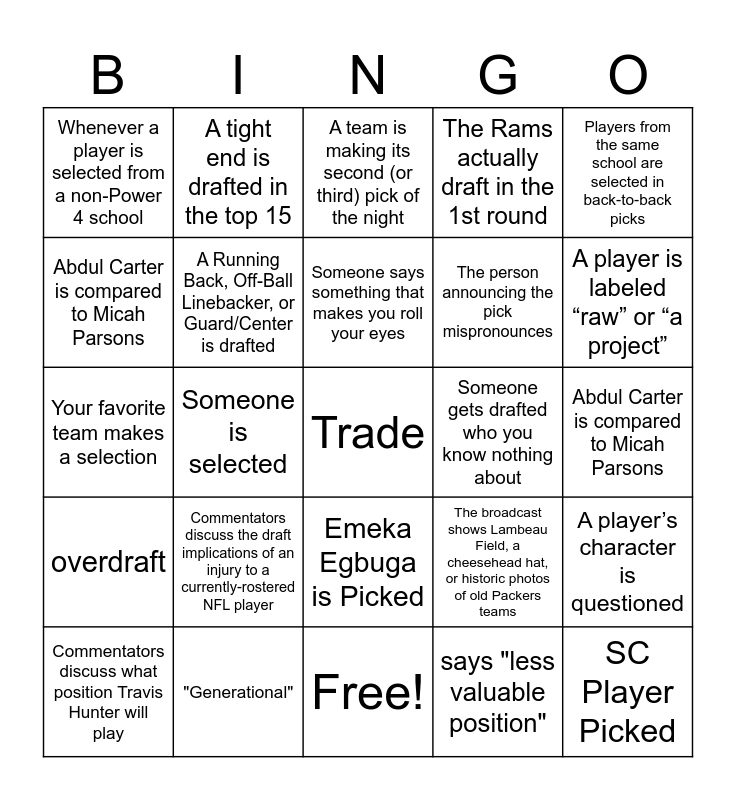 This bingo card has 25 words: overdraft, "Generational", Trade, says "less valuable position", Players from the same school are selected in back-to-back picks, Whenever a player is selected from a non-Power 4 school, A tight end is drafted in the top 15, A team is making its second (or third) pick of the night, Someone gets drafted who you know nothing about, A player’s character is questioned, Abdul Carter is compared to Micah Parsons, A Running Back, Off-Ball Linebacker, or Guard/Center is drafted, Free!, The broadcast shows Lambeau Field, a cheesehead hat, or historic photos of old Packers teams, A player is labeled “raw” or “a project”, Commentators discuss what position Travis Hunter will play, Someone is selected, Someone says something that makes you roll your eyes, The person announcing the pick mispronounces, Abdul Carter is compared to Micah Parsons, Your favorite team makes a selection, Commentators discuss the draft implications of an injury to a currently-rostered NFL player, Emeka Egbuga is Picked, The Rams actually draft in the 1st round and SC Player Picked.