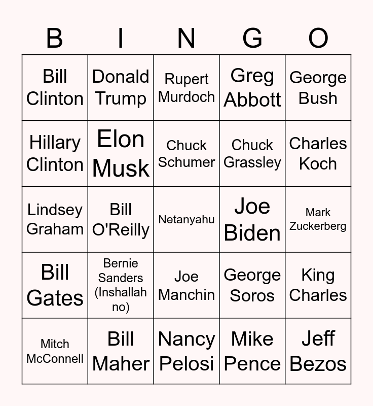 This bingo card has 25 words: Bernie Sanders (Inshallah no), Nancy Pelosi, Chuck Schumer, Mitch McConnell, George Bush, Bill Clinton, Hillary Clinton, Donald Trump, Joe Biden, Joe Manchin, Chuck Grassley, Lindsey Graham, George Soros, King Charles, Elon Musk, Jeff Bezos, Mark Zuckerberg, Rupert Murdoch, Charles Koch, Bill O'Reilly, Netanyahu, Bill Maher, Bill Gates, Greg Abbott and Mike Pence.