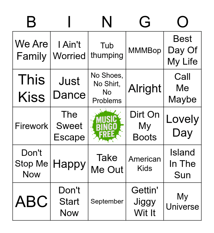 This bingo card has a free space and 74 words: Life Is A Highway, The Impression That I Get, Tub thumping, Song 2, The Monkees, Sugar, Sugar, The Twist, Crocodile Rock, ABC, Summer Nights, Y.M.C.A., Knee Deep, No Shoes, No Shirt, No Problems, This Kiss, Thank God I'm A Country Boy, The Sweet Escape, Shivers, Call Me Maybe, Butter, Firework, Just Dance, I Ain't Worried, MMMBop, Shake It Off, My Universe, Lil Boo Thang, Wake Me Up Before You Go-Go, Wannabe, Good Vibrations, Grace Kelly, Best Day Of My Life, I Wanna Dance With Somebody, One More Time, I Gotta Feeling, Walking On A Dream, Gettin' Jiggy Wit It, All I Wanna Do, Girls Just Want To Have Fun, Shut Up And Dance, Beautiful Day, September, Don't Start Now, Uptown Funk, Dancing Queen, Uptown Girl, We Are Family, Don't Worry Be Happy, Happy, Walking On Sunshine, Hit the Road Jake, Good Vibrations, Isn't She Lovely, Lovely Day, God's Plan, Beautiful, Jump, Take Me Out, Popular, Electric Feel, Island In The Sun, Alright, Float On, Don't Stop Me Now, Mr. Blue Sky, Dirt On My Boots, Boot Scootin' Boogie, Blue Clear Sky, Knockin' Boots, American Kids, Drink In My Hand, Cruise, Chicken Fried, Country Girl and Wagon Wheel.