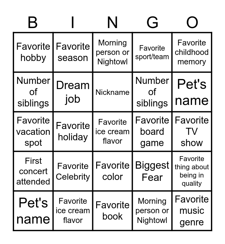 This bingo card has 56 words: Last watched movie, Pet's name, Bucket list destination, Favorite hobby, Favorite book, Favorite food, Dream job, Favorite TV show, Number of siblings, Favorite vacation spot, Favorite sport/team, First concert attended, Favorite season, Favorite color, Favorite music genre, Hidden Talent, Favorite childhood memory, Favorite holiday, Favorite Celebrity, Favorite ice cream flavor, Favorite board game, One thing you would take to a deserted island, Biggest Fear, Morning person or Nightowl, Something you cant live without, Nickname, Years worked at TTEC?, Last watched movie, Pet's name, Bucket list destination, Favorite hobby, Favorite book, Favorite food, Dream job, Favorite TV show, Number of siblings, Favorite vacation spot, Favorite sport/team, First concert attended, Favorite season, Favorite color, Favorite music genre, Hidden Talent, Favorite childhood memory, Favorite holiday, Favorite Celebrity, Favorite ice cream flavor, Favorite board game, One thing you would take to a deserted island, Biggest Fear, Morning person or Nightowl, Something you cant live without, Nickname, Years worked at TTEC?, Favorite thing about being in quality and Favorite TTEC value.