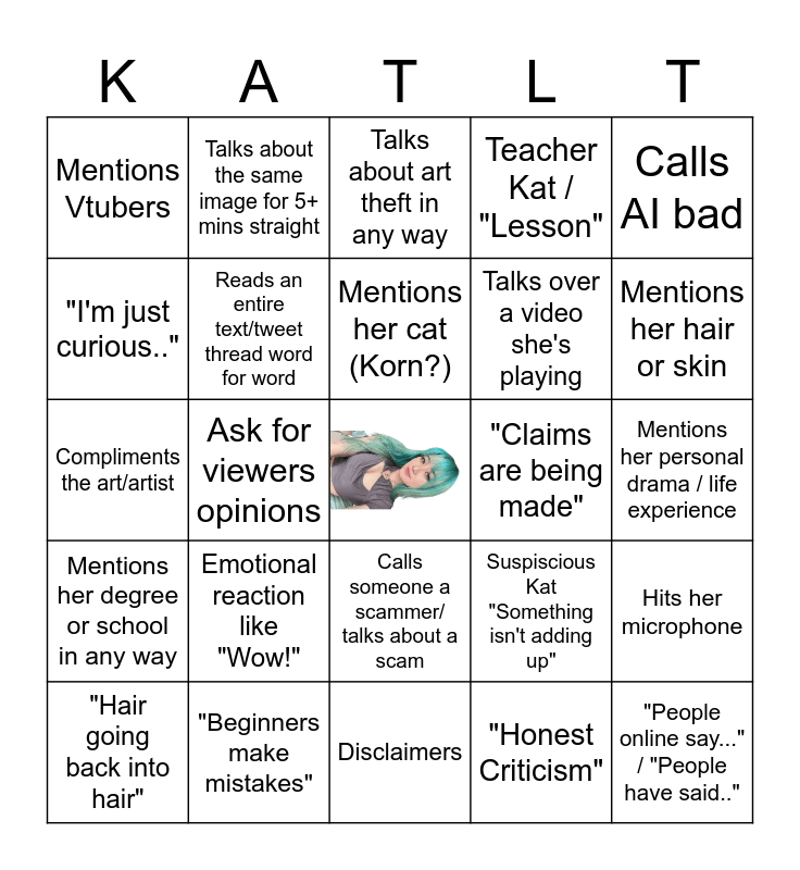This bingo card has a free space and 34 words: "Tinfoil Hat Theory", "Honest Criticism", "Just in my personal opinion", "Art Styles Are Different", Mentions her degree or school in any way, Reads an entire text/tweet thread word for word, Calls AI bad, "Hair going back into hair", Talks about the same image for 5+ mins straight, "Don't harass anyone involved", Mentions her cat (Korn?), Talks about art theft in any way, Talks about referencing or copyright, Says "*User* Says:" over 4 times in one minute, "Claims are being made", Mentions her hair or skin, "Beginners make mistakes", Compliments the art/artist, Emotional reaction like "Wow!", Suspiscious Kat "Something isn't adding up", Calls someone a scammer/ talks about a scam, "Go check out/support this artist", Mentions Vtubers, Mentions her personal drama / life experience, Disclaimers, "People online say..." / "People have said..", Teacher Kat / "Lesson", Watching an entire speedpaint, Talks over a video she's playing, "I'm just curious..", "Rabbit Hole", Ask for viewers opinions, Hits her microphone and Proportions / Colors are off in art.