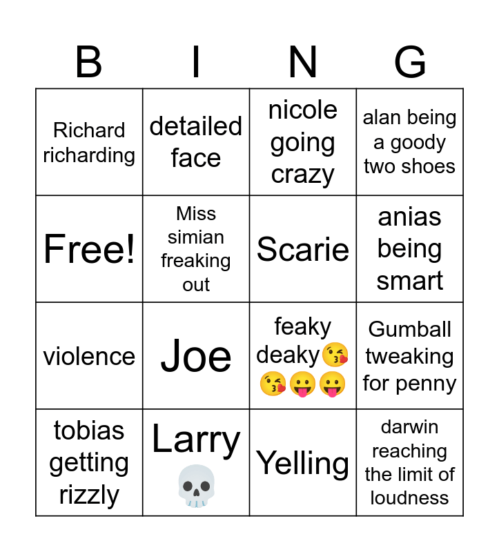 This bingo card has 16 words: Larry๐, Gumball tweaking for penny, nicole going crazy, Richard richarding, violence, detailed face, feaky deaky๐๐๐๐, Yelling, Free!, Miss simian freaking out, tobias getting rizzly, alan being a goody two shoes, Joe, anias being smart, Scarie and darwin reaching the limit of loudness.