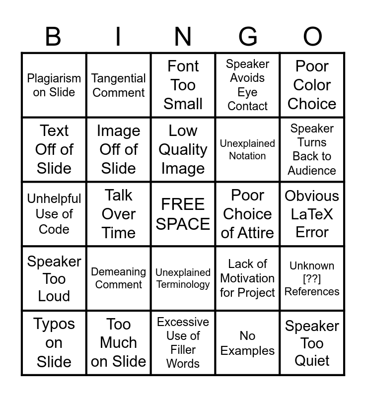 This bingo card has a free space and 24 words: Demeaning Comment, Too Much on Slide, Low Quality Image, Typos on Slide, Poor Color Choice, Plagiarism on Slide, Text Off of Slide, Tangential Comment, Poor Choice of Attire, Unexplained Terminology, Unexplained Notation, Unhelpful Use of Code, Lack of Motivation for Project, Unknown [??] References, Image Off of Slide, No Examples, Obvious LaTeX Error, Font Too Small, Speaker Turns Back to Audience, Talk Over Time, Speaker Too Quiet, Speaker Too Loud, Speaker Avoids Eye Contact and Excessive Use of Filler Words.