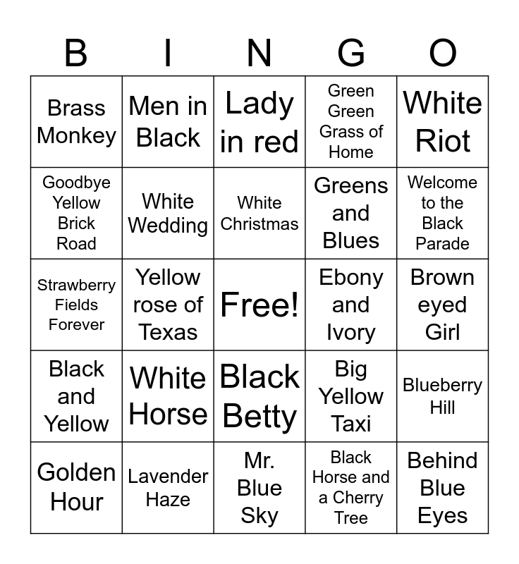 This bingo card has a free space and 83 words: Red, Fields of gold, Lady in red, Counting Blue Cars, White Rabbit, Blue Skies, Pretty in Pink, Blue Bayou, Black Dog, Black Hole Sun, Blue Velvet, Behind these Hazel Eyes, White Wedding, Ebony and Ivory, Long Cool woman in a Black Dress, Brass Monkey, Golden Hour, Goodbye Yellow Brick Road, Little Red Wagon, Silver Bells, Purple People Eater, Greens and Blues, Behind Blue Eyes, Blue Christmas, Yellow rose of Texas, Paint it Black, Yellow, Pink Elephants on Parade, Nights in White Satin, Blue Orchid, White Horse, Brown Sugar, It's Not Easy Being Green, Strawberry Fields Forever, 99 Red Balloons, Green Tambourine, Mr. Blue Sky, Little Red Rodeo, Welcome to the Black Parade, Black and Yellow, Blackbird, Mellow Yellow, Orange Crush, Tangled up in Blue, Ol' Red, White Flag, Men in Black, Red Red Wine, Rainbow in the Dark, Band of Gold, Big Yellow Taxi, Green Green Grass of Home, Brown eyed Girl, Itsy Bitsy Teenie Weenie Yellow Polka dot Bikini, Blue Monday, Blue (da ba dee), Whiter Shade of Pale, Yellow Submarine, Lavender Haze, Rose Colored Glasses, Rudolph the Red Nosed Reindeer, Green Onions, Maroon, White Riot, Blue Suede Shoes, Blueberry Hill, Black Magic Woman, Red Solo Cup, Little Red Corevette, Pink Pony Club, Purple Haze, Purple Rain, Blue Moon, Black Betty, Black Horse and a Cherry Tree, Crimson and Clover, Black Velvet, White Christmas, Black or White, Pink Houses, Rainbow Connection, Green Light and Raspberry Beret.