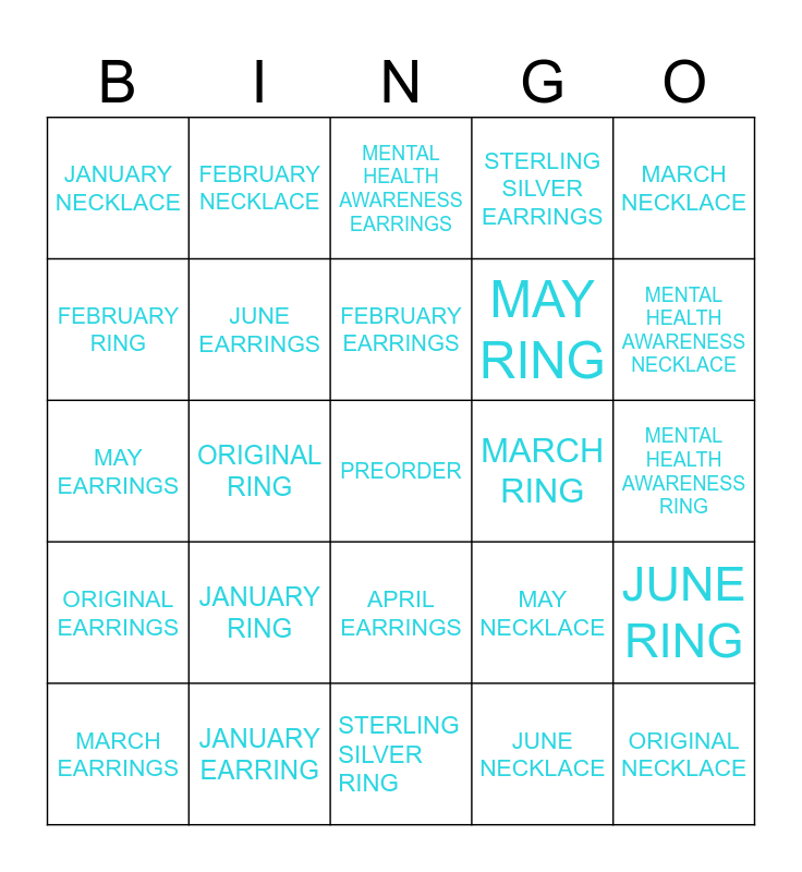 This bingo card has a free space and 24 words: JANUARY RING, JANUARY EARRING, FEBRUARY EARRINGS, MARCH EARRINGS, MARCH NECKLACE, JANUARY NECKLACE, FEBRUARY RING, FEBRUARY NECKLACE, MARCH RING, APRIL EARRINGS, MAY RING, MAY EARRINGS, MAY NECKLACE, JUNE RING, JUNE EARRINGS, JUNE NECKLACE, MENTAL HEALTH AWARENESS RING, MENTAL HEALTH AWARENESS EARRINGS, MENTAL HEALTH AWARENESS NECKLACE, ORIGINAL RING, ORIGINAL NECKLACE, ORIGINAL EARRINGS, STERLING SILVER EARRINGS and STERLING SILVER RING.