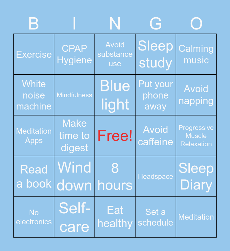 This bingo card has a free space and 29 words: No electronics, Therapy, Make time to digest, Cognitive reframing, Exercise, Avoid substance use, Mindfulness, Wind down, Avoid caffeine, Self-care, Progressive Muscle Relaxation, Meditation, Eat healthy, Set a schedule, Avoid napping, Consistent place for rest, 8 hours, Read a book, Calming music, Meditation Apps, Headspace, No social media, Put your phone away, White noise machine, Sleep study, CPAP Hygiene, Sleep Diary, Blue light and Stretching.