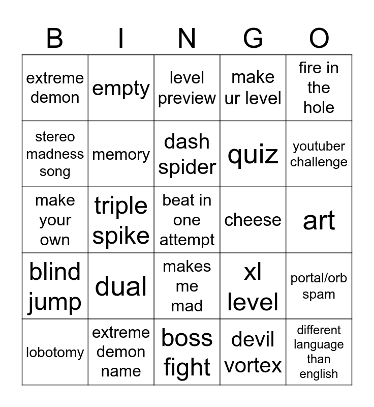 This bingo card has a free space and 24 words: dual, extreme demon name, dash spider, lobotomy, fire in the hole, extreme demon, stereo madness song, empty, cheese, makes me mad, quiz, make your own, xl level, portal/orb spam, memory, devil vortex, art, level preview, youtuber challenge, triple spike, different language than english, blind jump, make ur level and boss fight.