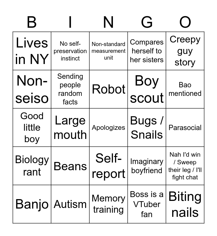 This bingo card has a free space and 24 words: Beans, Autism, Robot, Banjo, Creepy guy story, Lives in NY, Non-seiso, No self-preservation instinct, Bugs / Snails, Self-report, Boy scout, Good little boy, Imaginary boyfriend, Nah I'd win / Sweep their leg / I'll fight chat, Sending people random facts, Boss is a VTuber fan, Parasocial, Non-standard measurement unit, Bao mentioned, Large mouth, Biting nails, Biology rant, Compares herself to her sisters and Memory training.