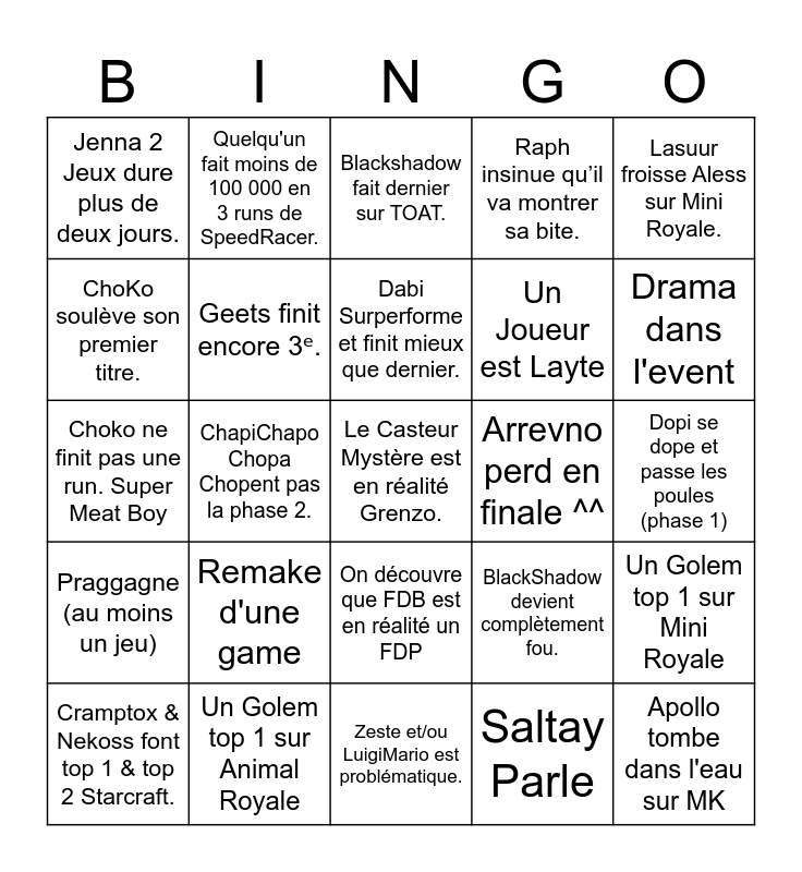 This bingo card has a free space and 24 words: Remake d'une game, Un Golem top 1 sur Animal Royale, Dabi Surperforme et finit mieux que dernier., Cramptox & Nekoss font top 1 & top 2 Starcraft., Lasuur froisse Aless sur Mini Royale., Jenna 2 Jeux dure plus de deux jours., ChoKo soulève son premier titre., Quelqu'un fait moins de 100 000 en 3 runs de SpeedRacer., Arrevno perd en finale ^^, On découvre que FDB est en réalité un FDP, Un Joueur est Layte, Choko ne finit pas une run. Super Meat Boy, BlackShadow devient complètement fou., Un Golem top 1 sur Mini Royale, Geets finit encore 3ᵉ., Saltay Parle, Dopi se dope et passe les poules (phase 1), Blackshadow fait dernier sur TOAT., Drama dans l'event, ChapiChapo Chopa Chopent pas la phase 2., Apollo tombe dans l'eau sur MK, Praggagne (au moins un jeu), Raph insinue qu’il va montrer sa bite. and Zeste et/ou LuigiMario est problématique..