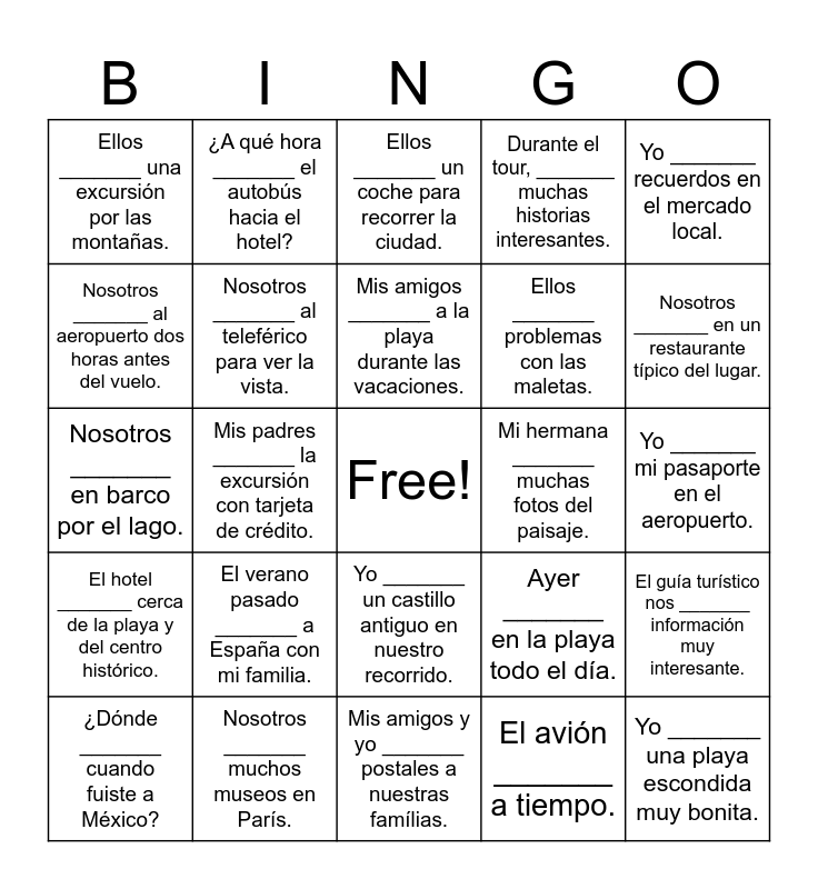 This bingo card has a free space and 24 words: El verano pasado _______ a España con mi familia., Nosotros _______ muchos museos en París., Mis amigos _______ a la playa durante las vacaciones., ¿Dónde _______ cuando fuiste a México?, Yo _______ recuerdos en el mercado local., Ellos _______ una excursión por las montañas., Nosotros _______ al aeropuerto dos horas antes del vuelo., ¿A qué hora _______ el autobús hacia el hotel?, Mi hermana _______ muchas fotos del paisaje., Yo _______ un castillo antiguo en nuestro recorrido., Ellos _______ problemas con las maletas., Nosotros _______ en barco por el lago., Ayer _______ en la playa todo el día., El guía turístico nos _______ información muy interesante., Nosotros _______ al teleférico para ver la vista., El avión _______ a tiempo., Yo _______ mi pasaporte en el aeropuerto., Ellos _______ un coche para recorrer la ciudad., Nosotros _______ en un restaurante típico del lugar., Mis padres _______ la excursión con tarjeta de crédito., Yo _______ una playa escondida muy bonita., El hotel _______ cerca de la playa y del centro histórico., Durante el tour, _______ muchas historias interesantes. and Mis amigos y yo _______ postales a nuestras famílias..