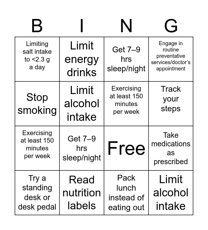 This bingo card has 16 words: Read nutrition labels, Take medications as prescribed, Get 7–9 hrs sleep/night, Limiting salt intake to <2.3 g a day, Exercising at least 150 minutes per week, Limit energy drinks, Free, Pack lunch instead of eating out, Stop smoking, Limit alcohol intake, Try a standing desk or desk pedal, Engage in routine preventative services/doctor’s appointment, Get 7–9 hrs sleep/night, Track your steps, Exercising at least 150 minutes per week and Limit alcohol intake.