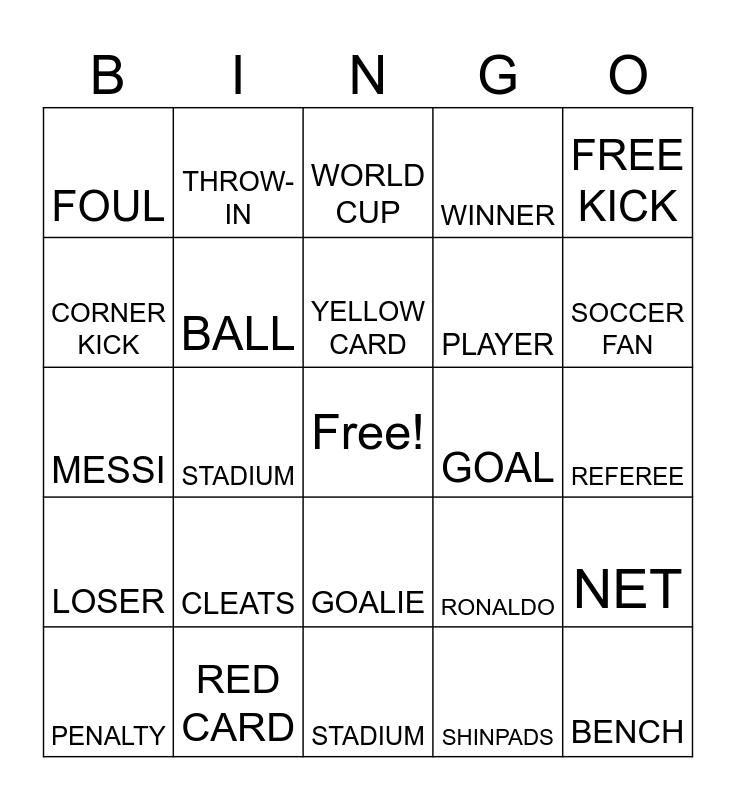 This bingo card has a free space and 24 words: CLEATS, RED CARD, YELLOW CARD, PENALTY, FREE KICK, FOUL, CORNER KICK, THROW-IN, GOAL, GOALIE, PLAYER, MESSI, RONALDO, NET, BALL, SHINPADS, REFEREE, WORLD CUP, SOCCER FAN, STADIUM, BENCH, LOSER, WINNER and STADIUM.