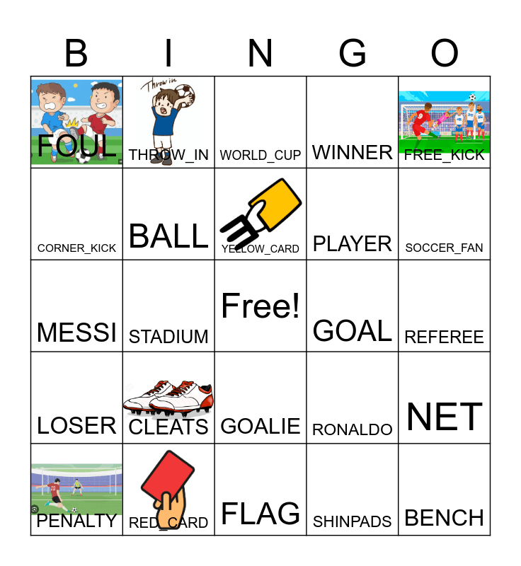This bingo card has 7 images, a free space and 24 words: CLEATS, RED_CARD, YELLOW_CARD, PENALTY, FREE_KICK, FOUL, CORNER_KICK, THROW_IN, GOAL, GOALIE, PLAYER, MESSI, RONALDO, NET, BALL, SHINPADS, REFEREE, WORLD_CUP, SOCCER_FAN, STADIUM, BENCH, LOSER, WINNER and FLAG.