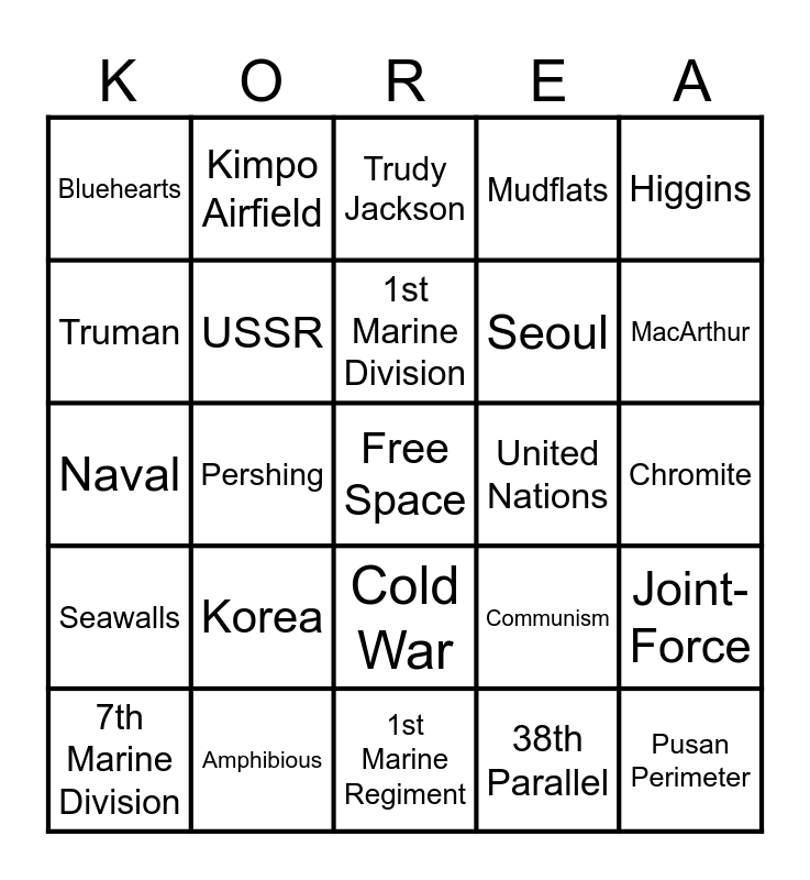 This bingo card has a free space and 24 words: Korea, Amphibious, 1st Marine Division, 7th Marine Division, Higgins, Bluehearts, Truman, Kimpo Airfield, United Nations, Cold War, Seoul, Naval, Communism, Joint-Force, USSR, 38th Parallel, Chromite, Trudy Jackson, MacArthur, Pershing, Pusan Perimeter, Seawalls, Mudflats and 1st Marine Regiment.
