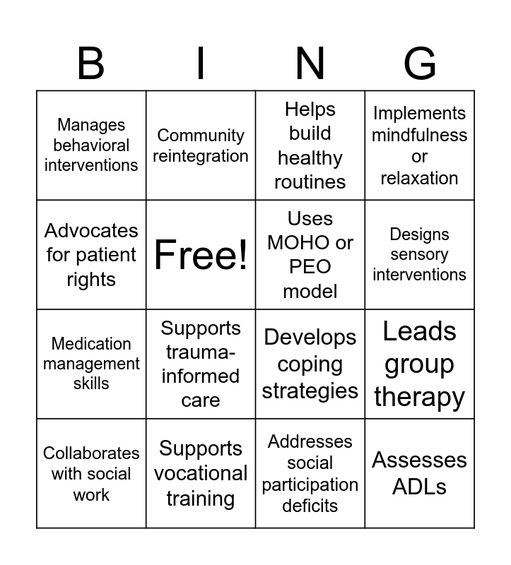 This bingo card has 16 words: Supports vocational training, Leads group therapy, Helps build healthy routines, Manages behavioral interventions, Medication management skills, Community reintegration, Develops coping strategies, Addresses social participation deficits, Advocates for patient rights, Free!, Collaborates with social work, Implements mindfulness or relaxation, Supports trauma-informed care, Designs sensory interventions, Uses MOHO or PEO model and Assesses ADLs.