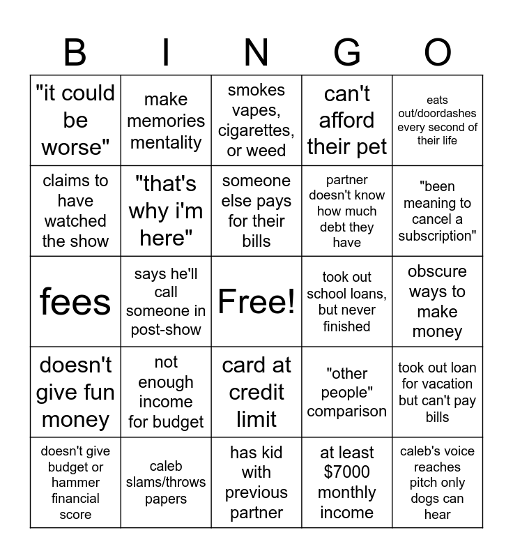 This bingo card has a free space and 24 words: not enough income for budget, caleb slams/throws papers, someone else pays for their bills, doesn't give budget or hammer financial score, eats out/doordashes every second of their life, "it could be worse", claims to have watched the show, make memories mentality, took out school loans, but never finished, card at credit limit, partner doesn't know how much debt they have, fees, "other people" comparison, took out loan for vacation but can't pay bills, "that's why i'm here", at least $7000 monthly income, obscure ways to make money, smokes vapes, cigarettes, or weed, "been meaning to cancel a subscription", says he'll call someone in post-show, caleb's voice reaches pitch only dogs can hear, doesn't give fun money, can't afford their pet and has kid with previous partner.
