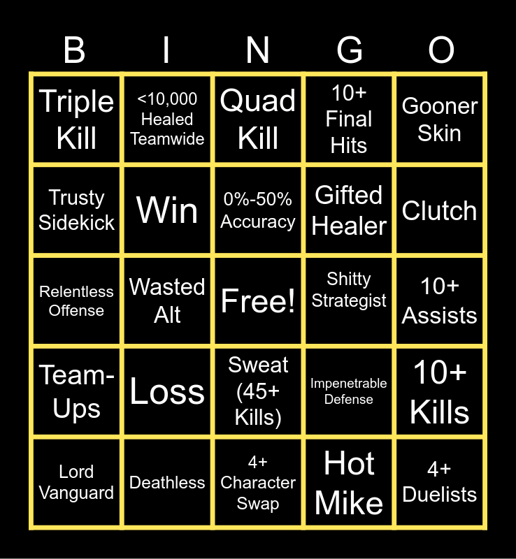 This bingo card has a free space and 29 words: Lord Vanguard, Lord Strategist, Wasted Alt, Solo Strategist, Triple Kill, Quad Kill, Win, Loss, Shitty Strategist, Deathless, 10+ Assists, 4+ Duelists, 4+ Character Swap, Hot Mike, Clutch, Ankh / Spider-Nest Ignored, Sweat (45+ Kills), Team-Ups, Gooner Skin, Relentless Offense, Impenetrable Defense, Mighty Vanquisher, Gifted Healer, Trusty Sidekick, 10+ Final Hits, <10,000 Healed Teamwide, 10+ Kills, 0%-50% Accuracy and 50%-100% Accuracy.