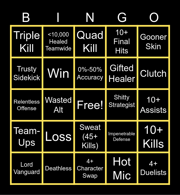 This bingo card has a free space and 29 words: Lord Vanguard, Lord Strategist, Wasted Alt, Solo Strategist, Triple Kill, Quad Kill, Win, Loss, Shitty Strategist, Deathless, 10+ Assists, 4+ Duelists, 4+ Character Swap, Hot Mic, Clutch, Ankh / Spider-Nest Ignored, Sweat (45+ Kills), Team-Ups, Gooner Skin, Relentless Offense, Impenetrable Defense, Mighty Vanquisher, Gifted Healer, Trusty Sidekick, 10+ Final Hits, <10,000 Healed Teamwide, 10+ Kills, 0%-50% Accuracy and 50%-100% Accuracy.