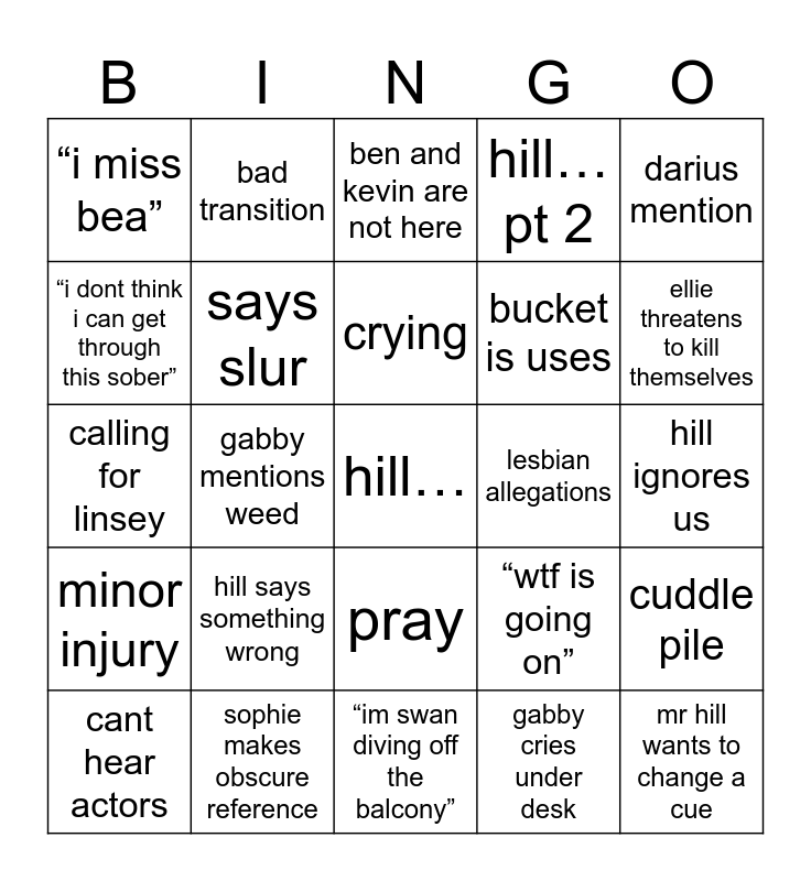 This bingo card has 1 images, a free space and 30 words: “im swan diving off the balcony”, miss cue, gabby mentions weed, “i miss bea”, ben and kevin are not here, says slur, “wtf is going on”, lesbian allegations, gabby cries under desk, hill ignores us, mr hill wants to change a cue, oscar mention, snack break, ellie threatens to kill themselves, uno, cuddle pile, hill says something wrong, minor injury, pray, darius mention, choking emote, cant hear actors, bad transition, bucket is uses, “i dont think i can get through this sober”, hill…pt 2, calling for linsey, sophie makes obscure reference, crying and “im so don rn “.
