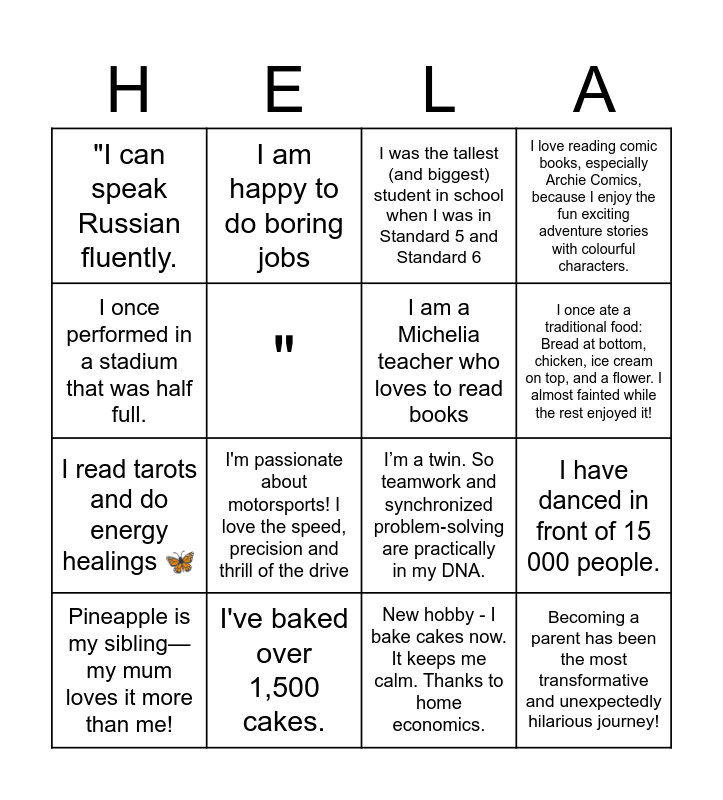This bingo card has 24 words: Sometimes, to destress, I watch videos of baby animals up to their antics as I find them adorable., I have a scar on my philtrum until my septum, I once ate a traditional food: Bread at bottom, chicken, ice cream on top, and a flower. I almost fainted while the rest enjoyed it!, I have never lived in the city where I was born., I once performed in a stadium that was half full., "I can speak Russian fluently., ", I am happy to do boring jobs, I've baked over 1,500 cakes., I like making my own Sudoku Puzzles., I read tarots and do energy healings 🦋, I’m a twin. So teamwork and synchronized problem‑solving are practically in my DNA., I eat to stay motivated. When I'm sad, I eat. When I'm happy, I eat too., I always scroll through food pictures before sleeping, I am a Michelia teacher who loves to read books, I collect old banknotes and coins!, New hobby - I bake cakes now. It keeps me calm. Thanks to home economics., I was the tallest (and biggest) student in school when I was in Standard 5 and Standard 6, I'm passionate about motorsports! I love the speed, precision and thrill of the drive, I have danced in front of 15 000 people., Pineapple is my sibling—my mum loves it more than me!, Becoming a parent has been the most transformative and unexpectedly hilarious journey!, I love reading comic books, especially Archie Comics, because I enjoy the fun exciting adventure stories with colourful characters. and I can dance, make animal sounds, and.....