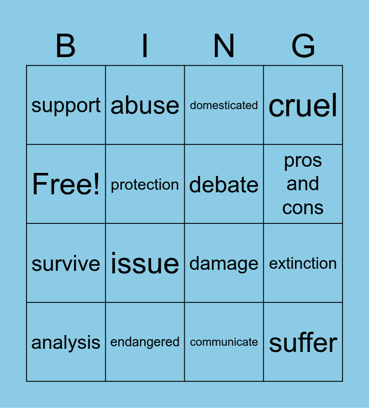 This bingo card has 16 words: endangered, extinction, domesticated, support, survive, abuse, damage, communicate, Free!, protection, analysis, cruel, issue, pros and cons, debate and suffer.