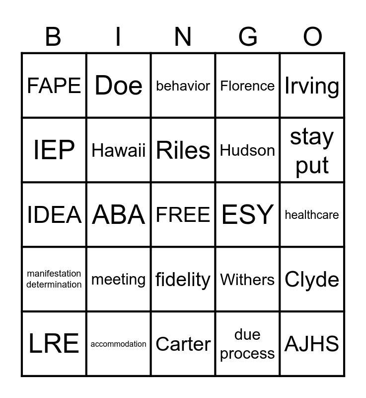 This bingo card has a free space and 29 words: LRE, parental involvement, ABA, academic, FAPE, behavior, Hawaii, meeting, ESY, accommodation, healthcare, AJHS, Carter, due process, stay put, inclusion, fidelity, manifestation determination, Irving, IDEA, Withers, need, Hudson, IEP, Florence, Doe, Clyde, Riles and Rowley.