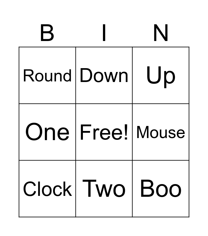 This bingo card has a free space and 8 words: Mouse, Up, Down, Clock, Round, Boo, One and Two.