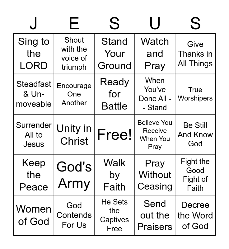 This bingo card has a free space and 25 words: Women of God, God's Army, Ready for Battle, Send out the Praisers, True Worshipers, Sing to the LORD, Shout with the voice of triumph, Stand Your Ground, When You've Done All -- Stand, Fight the Good Fight of Faith, Surrender All to Jesus, Encourage One Another, Pray Without Ceasing, Decree the Word of God, Steadfast & Un- moveable, God Contends For Us, He Sets the Captives Free, Watch and Pray, Be Still And Know God, Keep the Peace, Unity in Christ, Walk by Faith, Believe You Receive When You Pray, Give Thanks in All Things and Women of God.