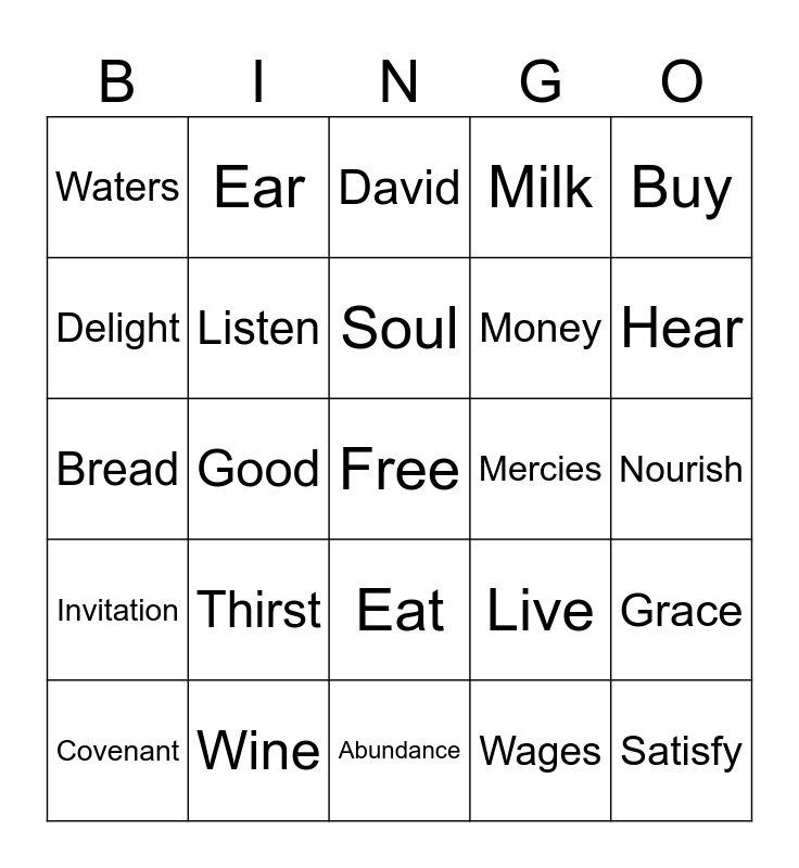 This bingo card has a free space and 24 words: Thirst, Wine, Soul, Covenant, Buy, Waters, Delight, Ear, Mercies, Eat, Money, Bread, Live, Grace, Listen, Wages, Nourish, David, Hear, Good, Satisfy, Invitation, Milk and Abundance.