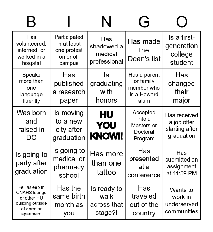 This bingo card has a free space and 24 words: Is going to medical or pharmacy school, Has the same birth month as you, Is graduating with honors, Fell asleep in CNAHS lounge or other HU building outside of dorm or apartment, Is a first-generation college student, Has volunteered, interned, or worked in a hospital, Speaks more than one language fluently, Participated in at least one protest on or off campus, Accepted into a Masters or Doctoral Program, Has more than one tattoo, Has a parent or family member who is a Howard alum, Was born and raised in DC, Has presented at a conference, Has submitted an assignment at 11:59 PM, Has published a research paper, Has traveled out of the country, Has received a job offer starting after graduation, Has shadowed a medical professional, Has changed their major, Is moving to a new city after graduation, Wants to work in underserved communities, Is going to party after graduation, Has made the Dean's list and Is ready to walk across that stage?!.