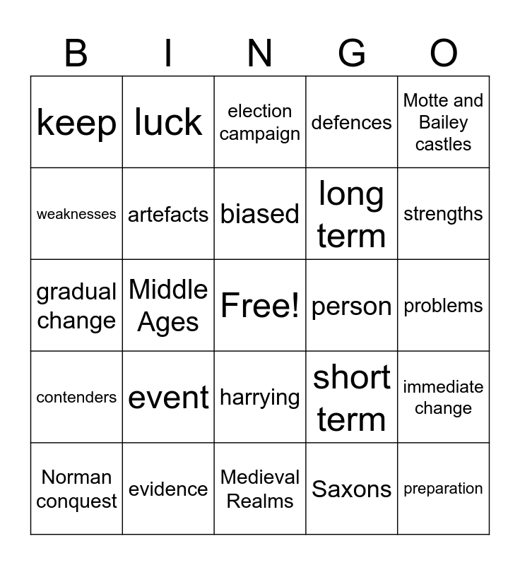This bingo card has a free space and 26 words: harrying, Saxons, biased, evidence, Motte and Bailey castles, keep, weaknesses, luck, problems, short term, long term, gradual change, immediate change, Norman conquest, Middle Ages, Battle of Hastings, defences, contenders, election campaign, preparation, strengths, Medieval Realms, person, event, artefacts and earldoms.