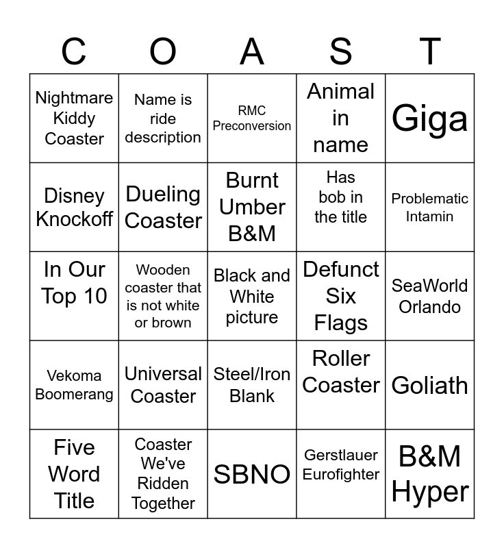 This bingo card has a free space and 24 words: Universal Coaster, Coaster We've Ridden Together, Burnt Umber B&M, Five Word Title, Giga, Nightmare Kiddy Coaster, Disney Knockoff, Name is ride description, Defunct Six Flags, Steel/Iron Blank, Has bob in the title, In Our Top 10, Roller Coaster, Goliath, Dueling Coaster, Gerstlauer Eurofighter, SeaWorld Orlando, RMC Preconversion, Problematic Intamin, Wooden coaster that is not white or brown, B&M Hyper, Vekoma Boomerang, Animal in name and SBNO.