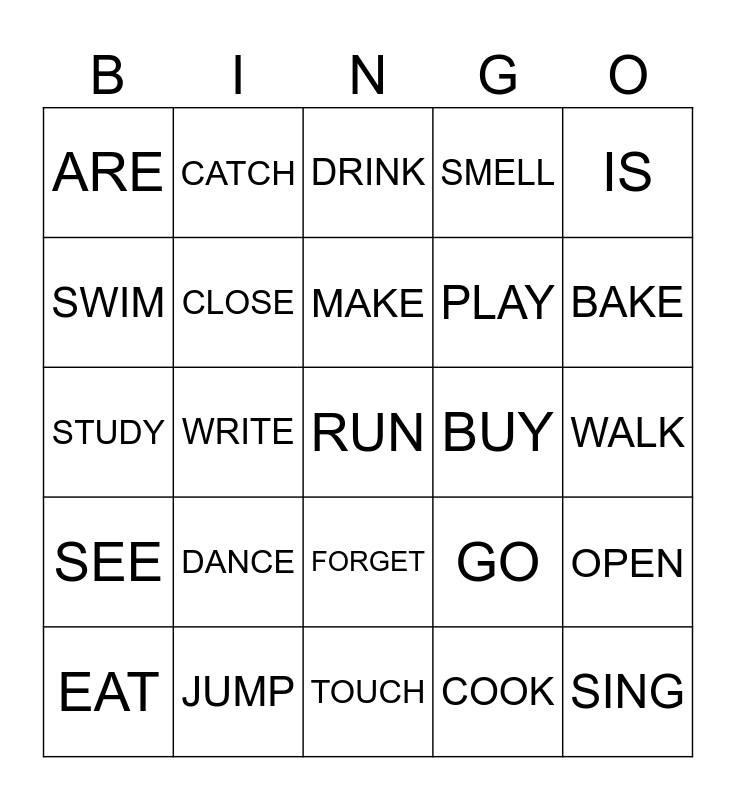 This bingo card has a free space and 24 words: DANCE, JUMP, MAKE, EAT, IS, ARE, SWIM, CATCH, BUY, FORGET, PLAY, STUDY, GO, OPEN, CLOSE, COOK, WALK, DRINK, BAKE, WRITE, SING, SEE, SMELL and TOUCH.