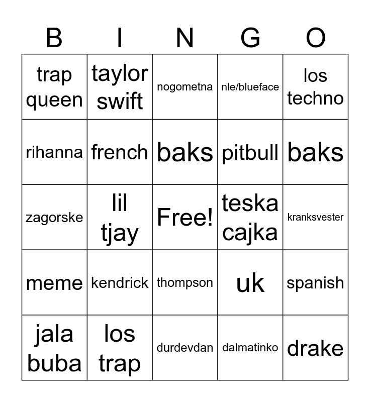 This bingo card has a free space and 24 words: kendrick, los trap, baks, jala buba, los techno, trap queen, rihanna, taylor swift, teska cajka, thompson, pitbull, zagorske, uk, spanish, french, dalmatinko, kranksvester, nogometna, baks, lil tjay, drake, meme, nle/blueface and durdevdan.