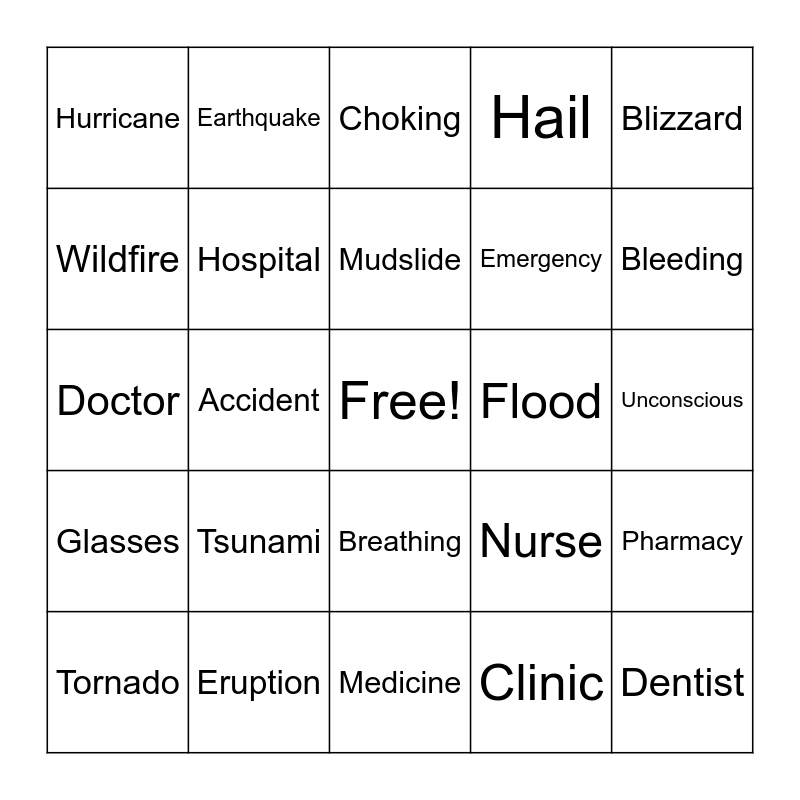 This bingo card has a free space and 24 words: Tsunami, Eruption, Mudslide, Tornado, Blizzard, Hurricane, Wildfire, Earthquake, Flood, Breathing, Emergency, Doctor, Nurse, Pharmacy, Hospital, Clinic, Unconscious, Choking, Bleeding, Accident, Dentist, Glasses, Hail and Medicine.