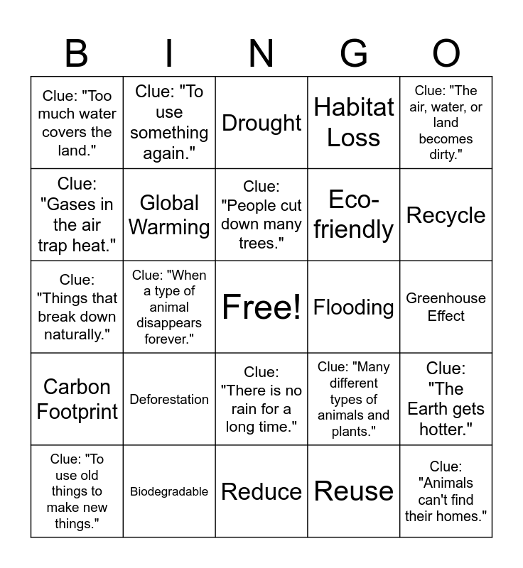 This bingo card has a free space and 37 words: Revised Bingo Call List - Environmental Vocabulary (8th Grade) - B1 Level, Climate Change, Clue: "The weather changes a lot over a long time.", Global Warming, Clue: "The Earth gets hotter.", Deforestation, Clue: "People cut down many trees.", Pollution, Clue: "The air, water, or land becomes dirty.", Extinction, Clue: "When a type of animal disappears forever.", Habitat Loss, Clue: "Animals can't find their homes.", Greenhouse Effect, Clue: "Gases in the air trap heat.", Carbon Footprint, Clue: "The amount of gases we create.", Drought, Clue: "There is no rain for a long time.", Flooding, Clue: "Too much water covers the land.", Recycle, Clue: "To use old things to make new things.", Reduce, Clue: "To use less.", Reuse, Clue: "To use something again.", Conserve, Clue: "To protect nature.", Renewable Energy, Clue: "Energy from the sun or wind.", Biodegradable, Clue: "Things that break down naturally.", Biodiversity, Clue: "Many different types of animals and plants.", Eco-friendly and Clue: "Good for the environment.".