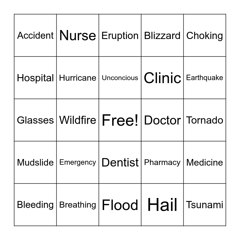 This bingo card has a free space and 24 words: Emergency, Breathing, Unconcious, Bleeding, Choking, Accident, Hospital, Nurse, Doctor, Dentist, Clinic, Glasses, Pharmacy, Medicine, Hurricane, Hail, Tornado, Eruption, Earthquake, Wildfire, Tsunami, Mudslide, Blizzard and Flood.